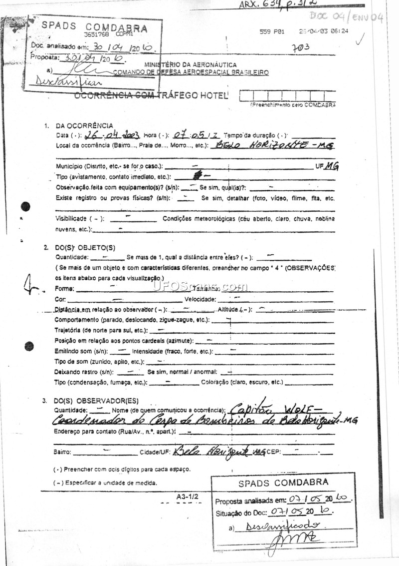 This document is a formal sighting report filed with the Brazilian Aerospace Defense Command (COMDABRA) regarding an unidentified aerial phenomenon reported on April 26, 2003, in Belo Horizonte, Minas Gerais. The report was initiated following a telephone communication from a Captain Wolf, identified as a coordinator with the Belo Horizonte Fire Department. According to the investigator's notes, Captain Wolf contacted the military to report information regarding an unidentified object in the airspace of Belo Horizonte. However, the report explicitly states that the witness himself did not observe the object and could not provide specific details regarding what was being seen. The document was processed by SPADS COMDABRA, initially classified as confidential, and subsequently declassified.
