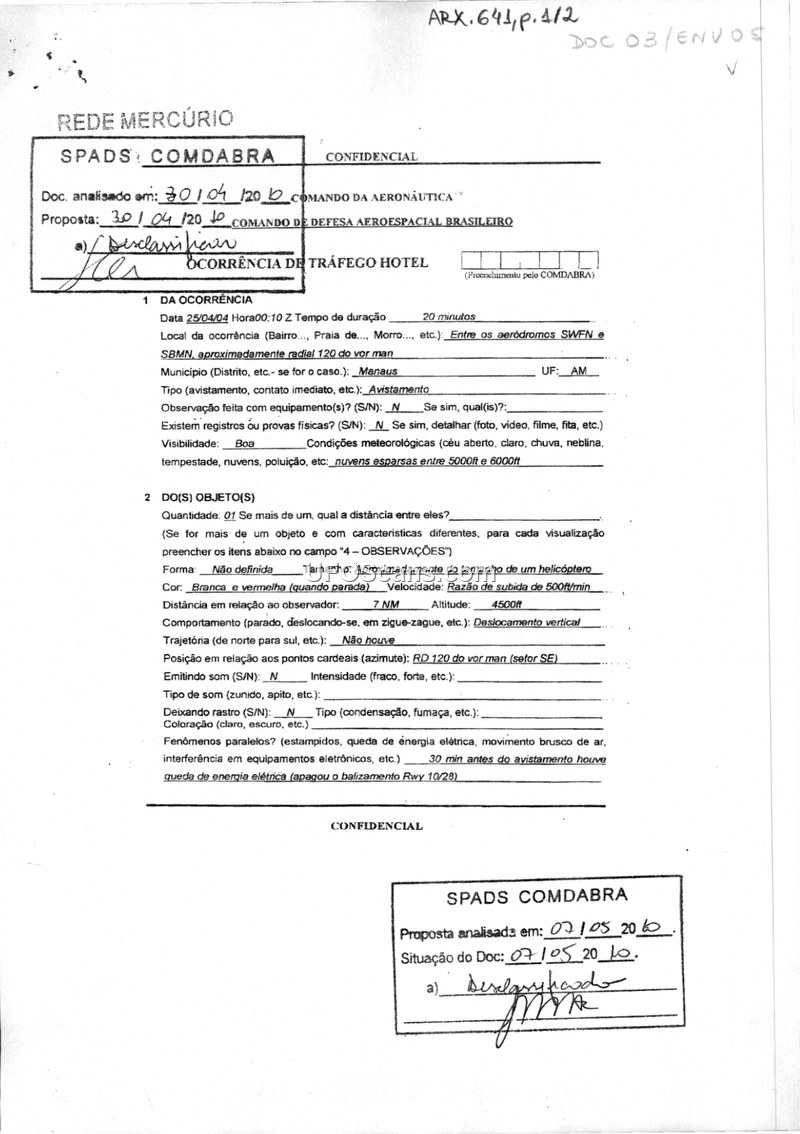 This document is a formal sighting report filed by the Brazilian Aerospace Defense Command (COMDABRA) regarding an unidentified aerial phenomenon observed on April 25, 2004, near Manaus. The witness, a military air traffic controller (3S BCT Edivaldo Cardoso dos Santos), reported observing a single object for approximately 20 minutes. The object was described as being approximately the size of a helicopter, appearing white and red when stationary, and exhibiting vertical displacement. The witness noted that 30 minutes prior to the sighting, there was a power failure that caused the runway lighting on Rwy 10/28 to go out. Despite the report, follow-up contact with the APP-MN operator confirmed that the object was not detected on terminal radar. The document is classified as 'Confidencial' and was processed by the SPADS COMDABRA unit.
