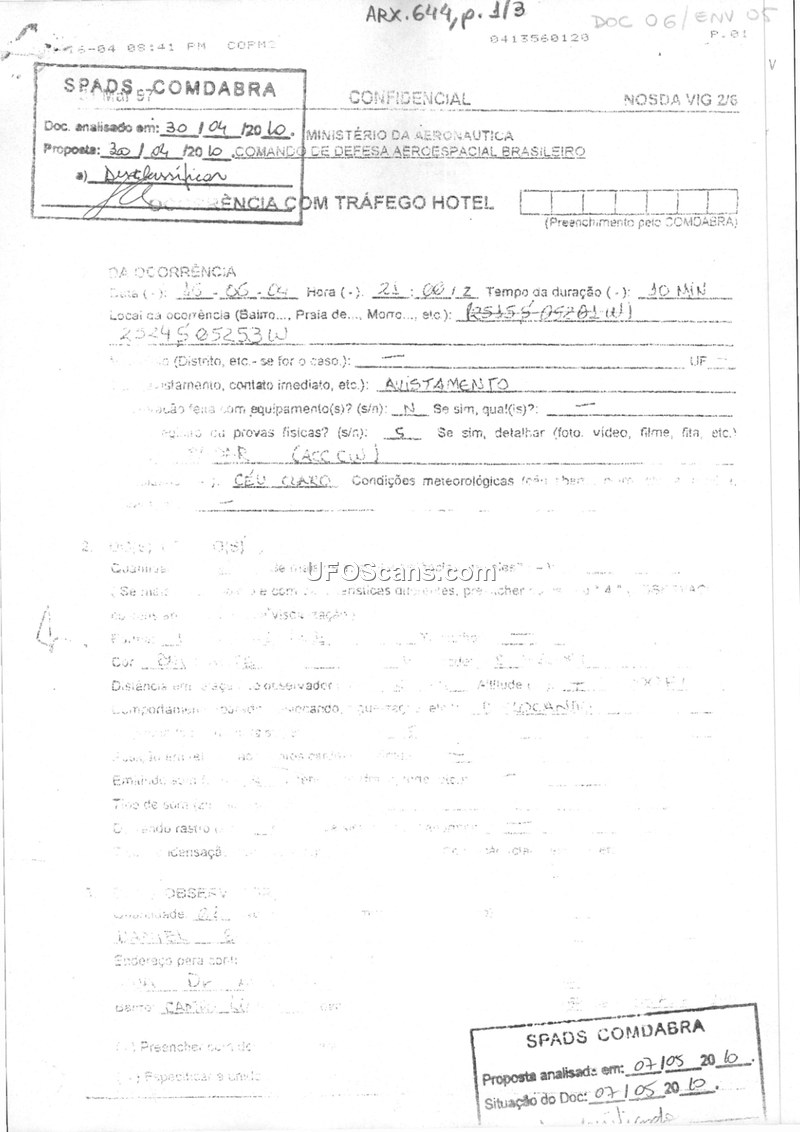 A 2004 Brazilian military sighting report detailing a 10-minute aerial event confirmed by radar contact with multiple plots varying in speed and heading.