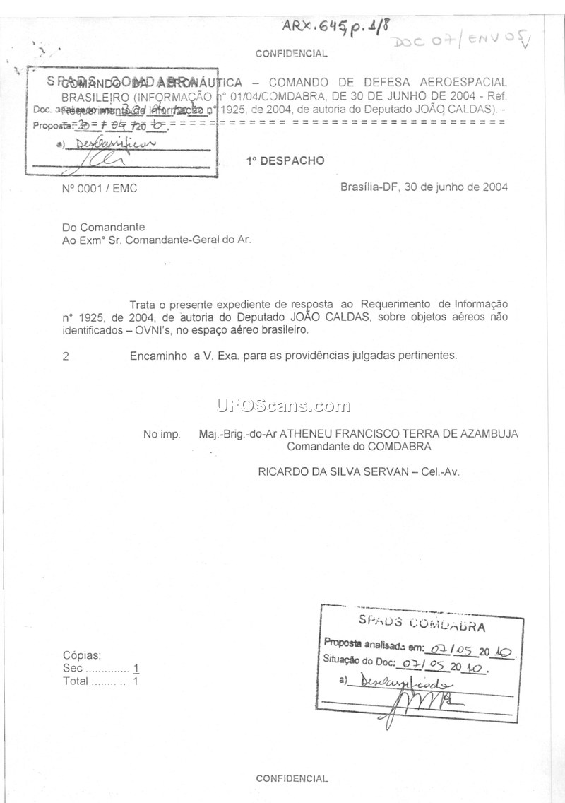This 2004 Brazilian military memorandum responds to a congressional inquiry about UFOs, providing details on the 1986 'Night of the UFOs' incident. It confirms that the military tracks such reports but lacks conclusive evidence regarding the nature of the objects.