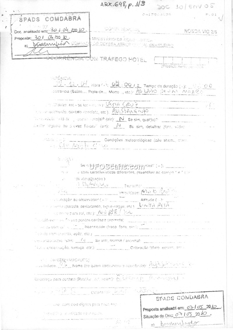 A 2004 Brazilian military report detailing a sighting of a triangular-shaped object moving in a straight line. The report was processed by COMDABRA in 2010.