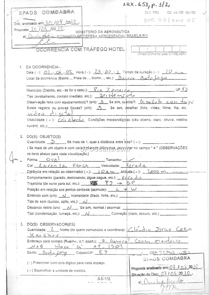 A formal military report detailing a sighting of three orange, oval-shaped objects over Botafogo, Rio de Janeiro, on April 1, 2005. The witness captured the event on digital video using binoculars.