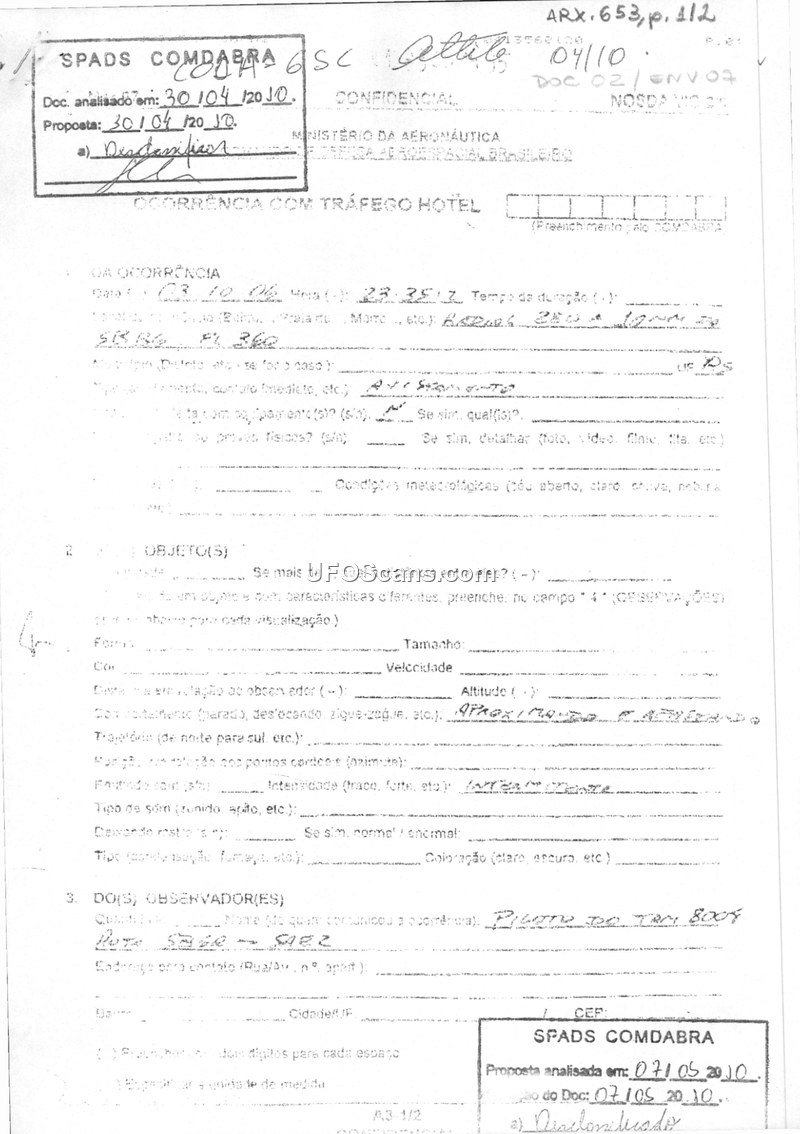 This document is a confidential sighting report filed with the Brazilian Ministry of Aeronautics (SPADS COMDABRA) regarding an incident that occurred on October 3, 2006. The report details a sighting by the pilot of flight TRM 8004, which was traveling the route SBBS to SAEZ. The pilot reported observing lights at an altitude of FL 360. The observations describe the lights as approaching and then moving away. The report includes a narrative section where the pilot notes that while flying at FL 360, approximately 10nm from their location, they observed two or three lights for 2 to 3 hours. The lights were described as moving and approaching the aircraft. The pilot further noted that they were in contact with Santiago control, who informed them that there were no other aircraft in the area, despite the pilot's visual confirmation of the lights. The document was analyzed by SPADS COMDABRA on May 7, 2010.