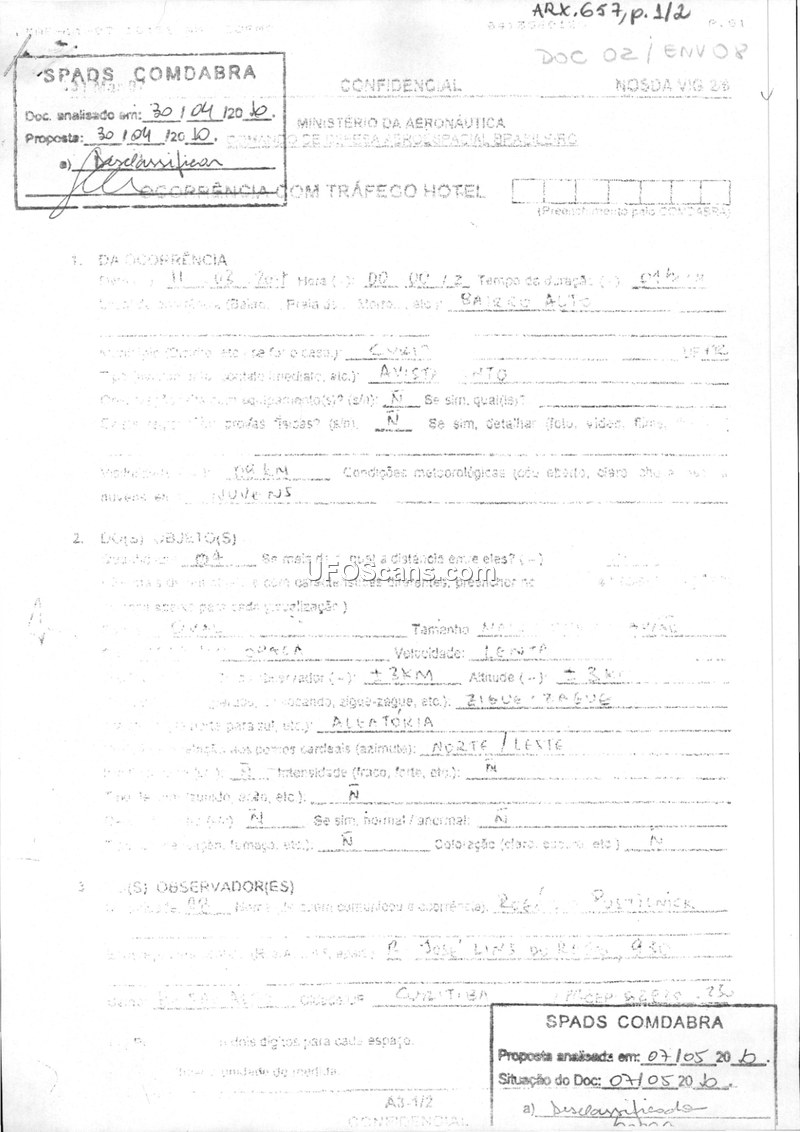 A 2001 Brazilian military report detailing a one-hour sighting of four unidentified objects moving in a zig-zag pattern over Curitiba. The report confirms no physical or radar evidence was collected.