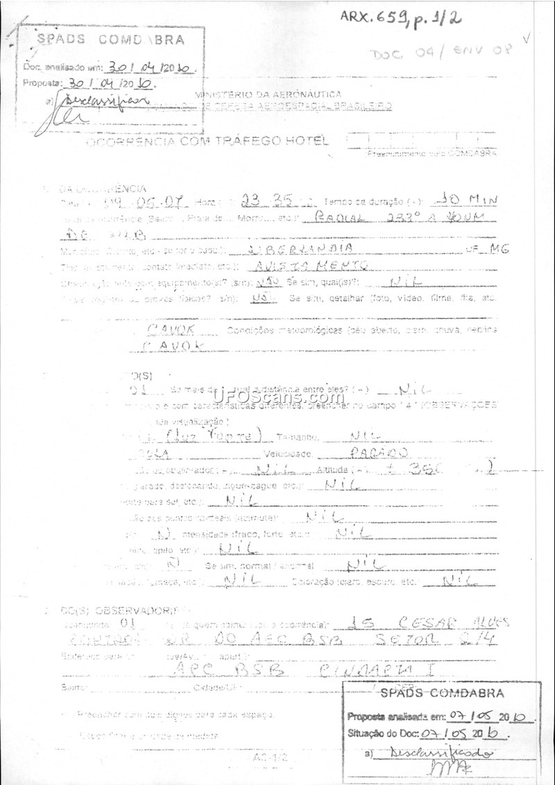 This document is a formal sighting report filed with the Brazilian Ministry of Aeronautics (SPADS COMDABRA) regarding an aerial phenomenon observed on May 9, 2007. The incident occurred at 23:35, approximately 40 nautical miles on the 233° radial from Uberlândia, Minas Gerais. The report details that flight crews from two aircraft, TAM 3465 and TAM 3071, observed a very strong light to the right of their flight paths. The crews initially believed the light might be essential traffic, but they were unable to determine the shape or size of the object. The object was described as stationary. The report explicitly states that there was no radar contact associated with the sighting. The document was processed by SPADS COMDABRA and declassified on May 7, 2010.