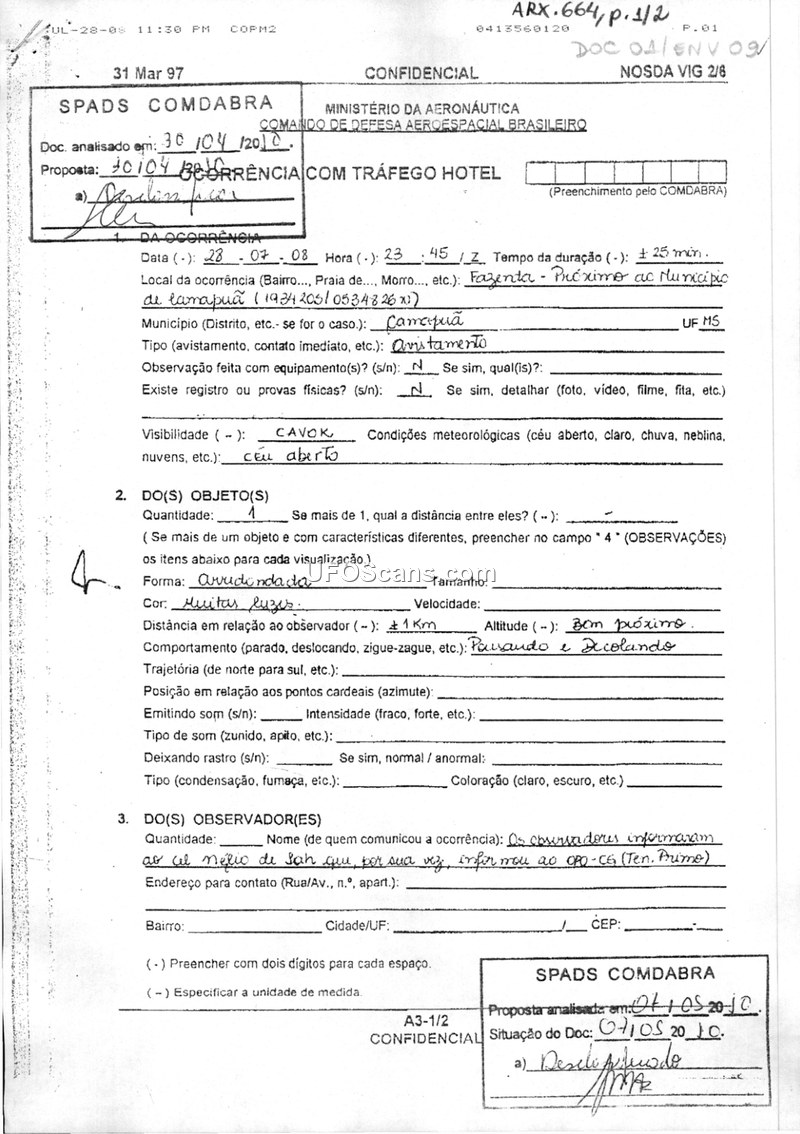 A military report detailing a 25-minute sighting of a rounded, multi-light object near Camapuã, Brazil, on July 28, 2008. The event was associated with local distress and a reported loss of telecommunications.