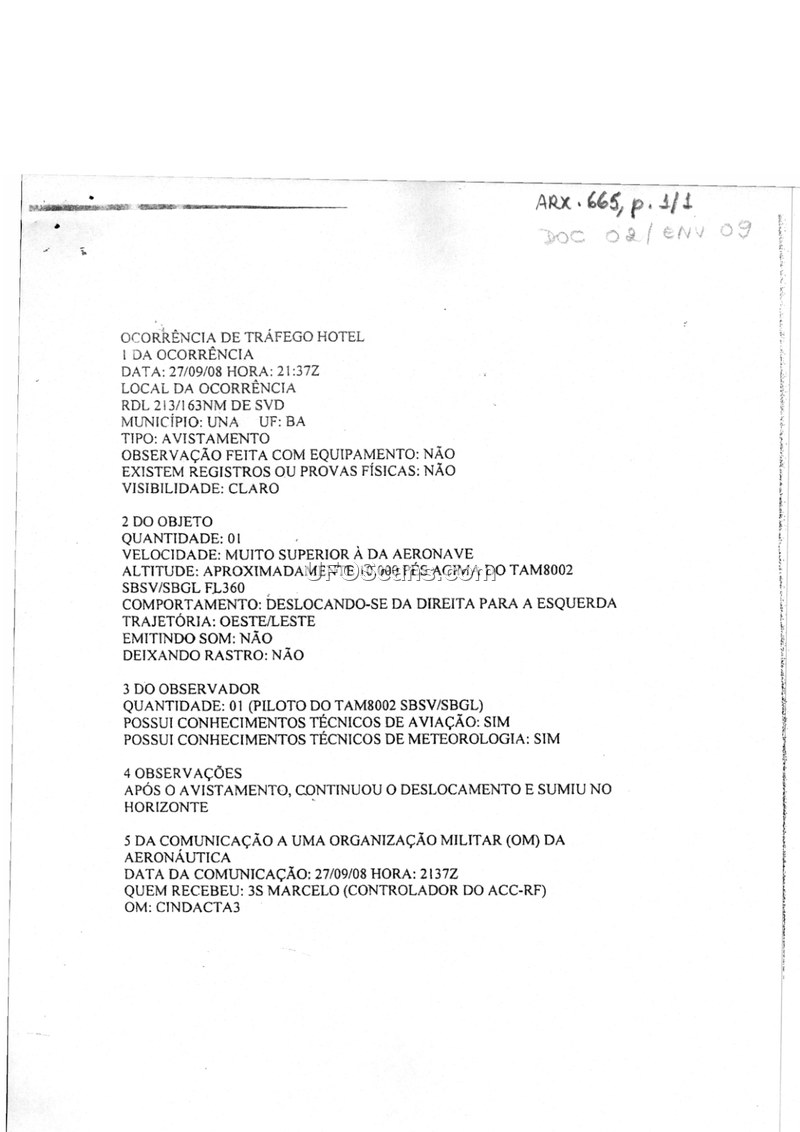 A pilot of flight TAM8002 reported an unidentified object moving at high speed approximately 10,000 feet above his aircraft on September 27, 2008. The report was officially filed with the Brazilian military organization CINDACTA 3.