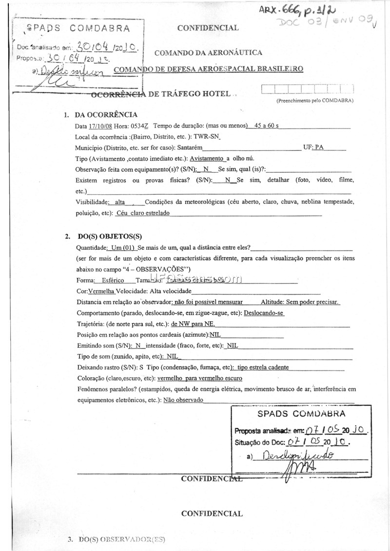 A report detailing a spherical, red aerial object observed by air traffic control and a commercial pilot near Santarém, Brazil, on October 17, 2008.