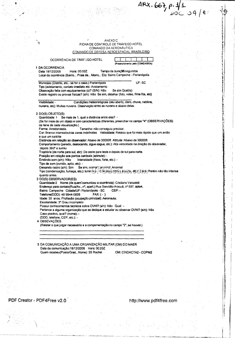 A Brazilian aeronaut reported a high-speed, luminous, rounded aerial object over Florianópolis on December 18, 2008. The object performed a 360-degree maneuver before disappearing, leaving a trail, but no physical evidence was recovered.