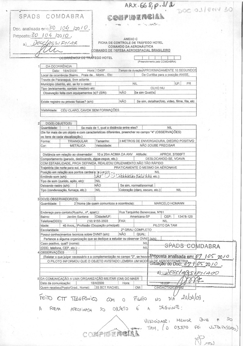 This document is a traffic control report (Ficha de Controle de Tráfego Hotel) filed by the Brazilian Aerospace Defense Command (COMDABRA) regarding an aerial sighting on April 18, 2009. The witness, a TAM airline pilot named Marcelo Homann, reported observing a metallic, triangular object with a wingspan of approximately 3 meters and positive dihedral. The sighting occurred at an altitude of approximately 37,000 feet while the pilot was flying from Curitiba toward the ANISE position, near Paranaguá. The object was observed for approximately 10 seconds, moving with stability and a defined heading, following a path similar to that of the pilot's aircraft. The pilot noted that the object's speed was slower than his own aircraft, as he was able to overtake it. The pilot remarked that the object resembled an aerophotogrammetry model. The report includes a follow-up telephone contact made on April 21, 2009, to clarify the object's characteristics. The document is marked as confidential and was processed by SPADS COMDABRA.