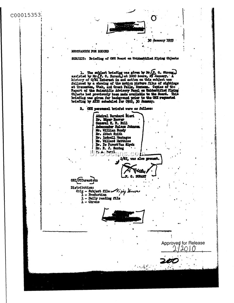 On 30 January 1953, a Memorandum for Record was issued by P. G. Durant regarding a briefing provided to the ONE Board concerning Unidentified Flying Objects. The briefing, conducted at 1000 hours on 29 January, was delivered by Mr. P. G. Durant with the assistance of Mr. F. C. Durant. The primary purpose of the session was to provide the ONE Board with historical context regarding OSI's interest in the subject of UFOs. As part of the presentation, motion picture footage documenting sightings in Tremonton, Utah, and Great Falls, Montana, was shown to the attendees. Additionally, the Board had previously been provided with copies of the Report of the Scientific Advisory Panel on Unidentified Flying Objects to serve as background material. The document lists the ONE personnel in attendance, including Admiral Bernhard Bieri, Dr. Higer Hoover, General K. R. Bull, Ambassador Nelson Johnson, Mr. William Bundy, Dr. Abbot Smith, Dr. Ludwell Montague, Mr. Willard Matthias, Dr. De Forest Van Slyck, Dr. R. J. Sontag, and F. A. Boral. The memorandum concludes by noting the distribution of the document to the subject file, production, daily reading file, and chrono.