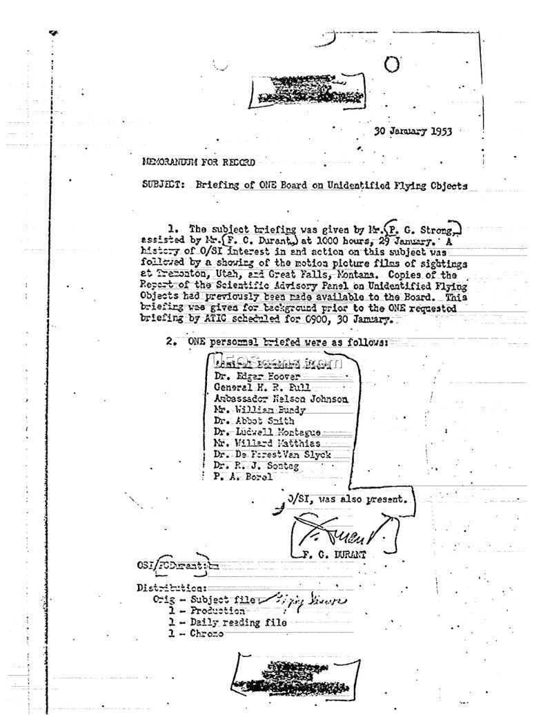 This memorandum for the record, dated 30 January 1953, documents a briefing provided to the ONE Board regarding Unidentified Flying Objects. The briefing was conducted on 29 January 1953 at 1000 hours by Mr. P. G. Strong, with assistance from Mr. F. C. Durant. The primary purpose of the session was to provide background information on O/SI interest in the subject, as requested by the ONE board in anticipation of a subsequent briefing by ATIC scheduled for 30 January. During the presentation, attendees were shown motion picture films of sightings that occurred in Tremonton, Utah, and Great Falls, Montana. Additionally, the board was provided with copies of the Report of the Scientific Advisory Panel on Unidentified Flying Objects, which had been made available to them previously. The document lists the ONE personnel in attendance, including Admiral Bernhard Bieri, Dr. Edgar Hoover, General H. R. Full, Ambassador Nelson Johnson, Mr. William Bundy, Dr. Abbot Smith, Dr. Ludwell Montague, Mr. Willard Matthias, Dr. De Forest Van Slyck, Dr. R. J. Sontag, and P. A. Borel. A representative from O/SI was also noted as present.