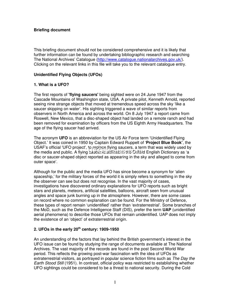 Finally, the document serves as a guide to the extensive records held at The National Archives, explaining the categories of material available—including policy files, parliamentary correspondence, and sighting reports—and the history of file preservation and destruction policies. It highlights the transition toward transparency, noting the release of files under the Freedom of Information Act and the ongoing efforts to transfer remaining records to the public domain.