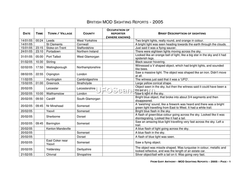 This document is a chronological log of UFO sighting reports submitted to the British Ministry of Defence during 2005. It provides a summary of public observations across the UK, ranging from simple light sightings to complex descriptions of craft.