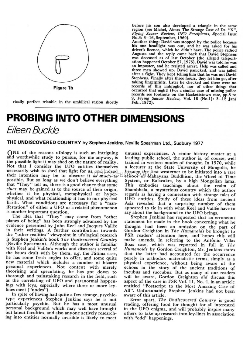 This document consists of two distinct sections related to ufology. The first section, written by Eileen Buckle, reviews the book 'The Undiscovered Country' by Stephen Jenkins. Buckle discusses the broader field of ufology, referencing the work of John Keel and Jacques Vallée, and notes Jenkins's background as a scholar who studied Mahayana Buddhism in Mongolia. The text also touches upon a specific missing person case involving an individual named David Stephens, who was reportedly declared deceased despite later appearing to be alive. The second section, written by Jennie Zeidman, provides a detailed analysis of the 'Coyne Helicopter Case' which occurred on October 18, 1973, near Mansfield, Ohio. Zeidman describes an encounter between a US Army Reserve UH-1H helicopter piloted by Captain Lawrence J. Coyne and an unidentified cigar-shaped object. The object displayed a red nose light, a white tail light, and a green light underneath. It performed a series of maneuvers, including a rapid approach and a near-hovering position, during which it emitted a pyramid-shaped green light into the helicopter cockpit. The encounter resulted in radio and magnetic compass malfunctions. Zeidman notes that subsequent investigations, including interviews with ground witnesses like Yanacsek and Healey, helped reconstruct the flight path and timing, leading to the conclusion that the object's behavior was inconsistent with conventional aircraft or meteorological phenomena.