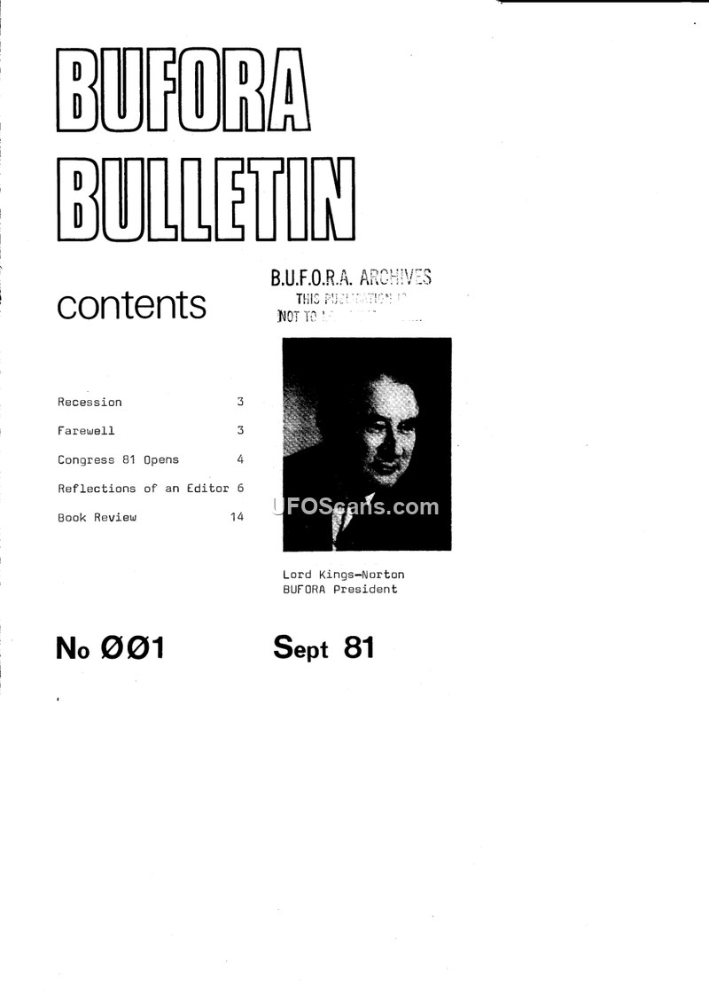 This document is the first issue of the BUFORA Bulletin, dated September 1981, published by the British UFO Research Association. The bulletin serves as an organizational update, announcing a shift from the previous 'Journal' format to a 'Bulletin' format due to severe financial constraints and the high cost of printing the former publication. The leadership, including Treasurer J. L. Spencer and Chairman L. W. Bayer, emphasizes that this change is intended to maintain contact with members while reducing costs to prevent the collapse of the association. The issue includes a farewell message from the outgoing editor, Norman Oliver, who reflects on his tenure and the challenges of producing the journal. The bulletin also features a speech by the BUFORA President, Lord Kings-Norton, delivered at the BUFORA International Congress on May 24, 1981. In his address, Lord Kings-Norton discusses his skeptical but open-minded approach to the study of Unidentified Flying Objects, distinguishing between the existence of unidentified objects in the sky and the assumption of extraterrestrial origins. He advocates for rigorous scientific investigation and the elimination of natural explanations before considering more exotic hypotheses. Additionally, the bulletin contains an article by Charles Bowen titled 'Reflections of an Editor,' which discusses the current 'recession' in UFO reporting, comparing it to similar periods in the past, such as the early 1960s. Bowen provides historical context on UFO research, mentioning cases like the 1963 Whidby Island incident and the 1965 Valensole case, and encourages researchers to re-examine older cases during the current lull in new reports. The document also includes administrative information, book reviews, and advertisements for UFO-related materials.