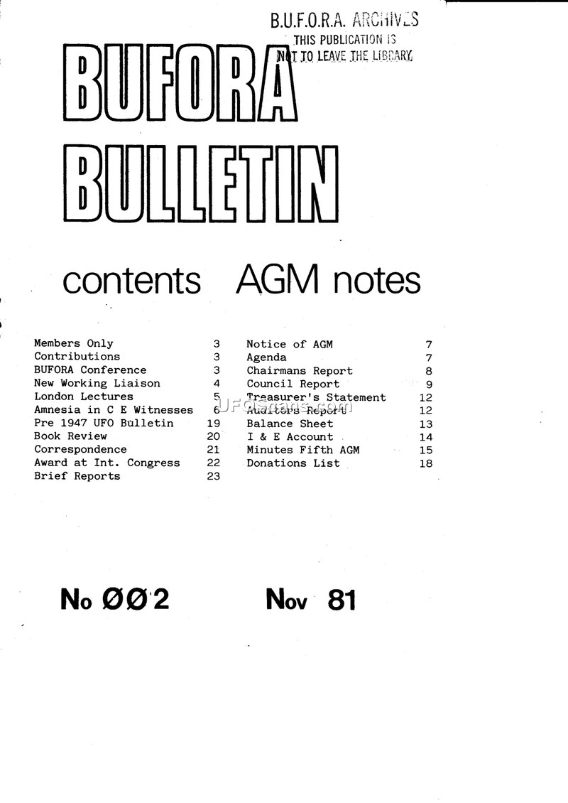 This document is the November 1981 issue (No. 002) of the BUFORA Bulletin, published by the British UFO Research Association. It serves as an administrative record for the association, detailing the proceedings of the Council of Management, financial reports, and organizational updates. The bulletin includes the notice for the Sixth Annual General Meeting, held in December 1981, and provides the minutes from the Fifth Annual General Meeting held in December 1980. Financial challenges are a central theme, with the Treasurer's Statement noting a struggle to overcome inherited debts and overspending, leading to the discontinuation of the BUFORA Journal in favor of the more frequent, lower-cost Bulletin. The document outlines the association's structure, listing officers and branch contacts, and highlights the organization's commitment to unbiased scientific research. A significant portion of the text is dedicated to the 'New Working Liaison' between local groups, specifically the Northern UFO Network (NUFON) and the Members of the Affiliated UFO Groups (MAUFOG), aiming to foster cooperation and establish a joint code of practice for UFO investigation. The bulletin also reports on the 2nd London International Congress, held in May 1981, which featured international speakers and was opened by Lord Kings Norton. Research activities are discussed, including the use of a punched card analysis system and the development of a new computer-based system for processing sighting reports. Additionally, the bulletin contains a section on 'Amnesia in Close Encounter Witnesses' by Moira McGhee, exploring the scientific aspects of memory loss in contactees, and a 'Pre-1947 UFO Bulletin' section focusing on historical 'airship' sightings. The document concludes with brief reports on recent sighting incidents and an advertisement section for BUFORA publications.