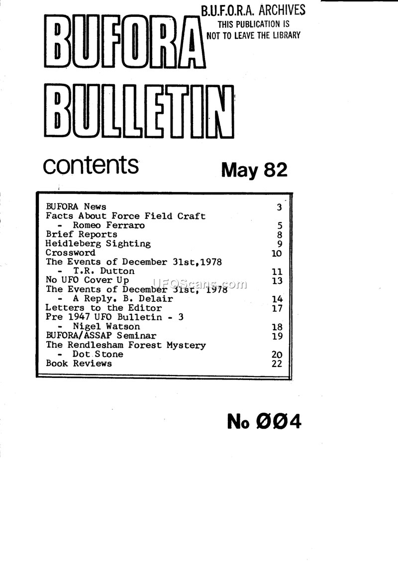 This document is the May 1982 issue of the BUFORA Bulletin (No. 004), published by the British UFO Research Association. The bulletin serves as a record of the organization's activities, including a report on the National Conference held in Edinburgh in March 1982, where speakers discussed topics such as hypnotic regression, investigation networks, and the Livingston CE case. The bulletin also features a significant section on the Rendlesham Forest incident, with reports by Dot Street detailing investigations into a landing event near Woodbridge, Suffolk, in early 1981. The text includes a debate regarding the interpretation of UFO sightings from December 31, 1978, with contributors T.R. Dutton and Bernard Delair discussing whether these events were related to the re-entry of the COSMOS 1068 rocket or represented intelligently controlled UFO activity. Furthermore, the bulletin addresses government transparency, citing a statement by Viscount Long in the House of Lords confirming that the Ministry of Defence has preserved UFO reports since 1967. The issue also contains historical perspectives, such as Nigel Watson's analysis of pre-1947 airship scares, and provides administrative information regarding BUFORA's council, membership, and upcoming seminars. The publication reflects the organization's commitment to unbiased scientific research and the dissemination of data regarding unidentified aerial phenomena.