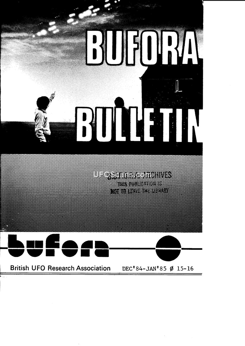 This document is the December 1984/January 1985 issue (No. 15-16) of the BUFORA Bulletin, published by the British UFO Research Association. The bulletin serves as a central repository for organizational news, research updates, and investigative articles concerning Unidentified Aerial Phenomena (UAP). The issue contains a variety of content, including a historical overview of UFO sightings in Australia by Paul Norman, which discusses cases such as the disappearance of the SS Amelia J in 1920, the Miss Hobart mystery in 1935, and the 1978 disappearance of pilot Frederick Valentich. John Spencer contributes an article critically examining the use of regressive hypnosis in UFO abduction research, arguing that it is an unreliable tool that may inadvertently create or reinforce fantasies rather than recover objective memories. The bulletin also features reports from the National Investigations Committee (NIC), detailing their photographic policy and efforts to computerize case data using Spectrum computers. Jenny Randles provides an account of her involvement in a BBC Wales documentary regarding UFO files released by the Ministry of Defence, highlighting the 'OZ Factor'—a subjective consciousness phenomenon she observes in witnesses. Additionally, the issue includes a bibliography of UFO literature, letters to the editor debating the 'Pennine UFO mystery' and the Hessdalen sightings in Norway, and announcements regarding upcoming lectures at the London Business School. The document emphasizes the association's commitment to unbiased scientific research and the coordination of UFO investigations throughout the United Kingdom.
