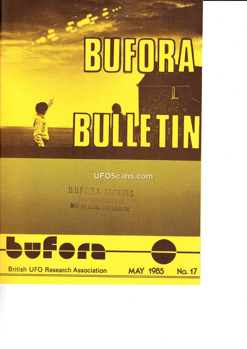 This document is the May 1985 issue (No. 17) of the British UFO Research Association (BUFORA) Bulletin. It serves as a compilation of research, investigative reports, and theoretical discussions regarding Unidentified Aerial Phenomena (UAP). A significant portion of the bulletin is dedicated to the 1978 disappearance of Australian pilot Frederick Valentich over Bass Strait, featuring a transcript of his final communications with Melbourne Flight Service. The bulletin also covers other Australian sightings, including the 'White Acres' physical trace case from 1980, and various reports from the UK, such as the 'Repeater Ball Lightning' case in Leicestershire and sightings in Harwich Harbour and Hatfield Peverel. The publication emphasizes the importance of scientific methodology in UFO research, advocating for the consideration of psychological, sociological, and religious factors that may influence witness reports. It includes reports from the National Investigators' Committee (NIC) meeting held in London in March 1985, detailing ongoing investigations into specific photographic evidence and the 'Anamnesis' project. The bulletin also provides a list of accredited BUFORA investigators and includes a 'Letters to the Editor' section where members discuss the nature of UFO sightings, including the possibility of misidentified natural phenomena like planets, stars, and weather balloons. The document reflects the association's commitment to collecting and disseminating evidence while maintaining a critical perspective on the 'UFO enigma'.