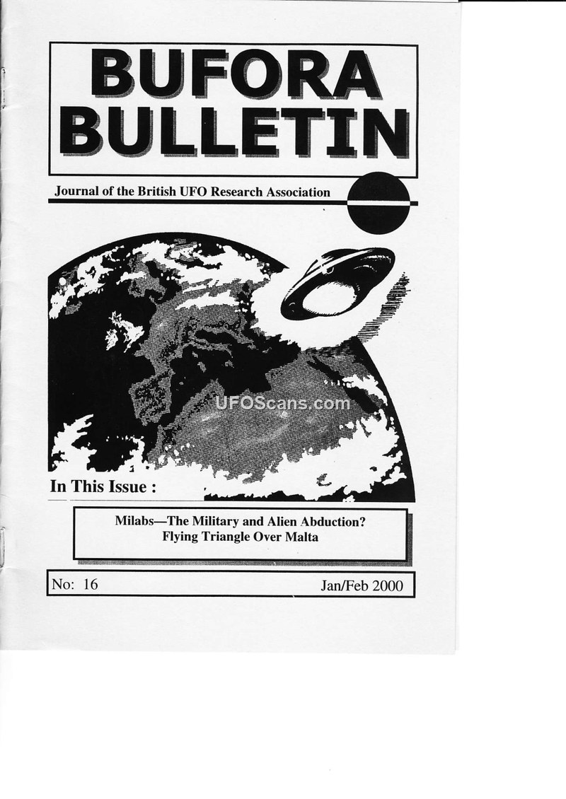 This document is the January/February 2000 issue (No. 16) of the BUFORA Bulletin, the official journal of the British UFO Research Association. The issue serves as a record of the association's activities, administrative updates, and research articles. A significant portion of the bulletin is dedicated to the death of Arnold West, a long-serving Vice-President and company secretary, and the subsequent administrative adjustments required for the organization. The bulletin includes an editorial by Steve Gamble, astronomy notes by Brian P. James regarding planetary alignments and meteor sightings, and a report on a joint skywatch event at Avebury conducted by APRA and SUFOG. A major feature article by Malcolm Robinson explores the concept of 'MILABS' (Military Mind Control and Alien Abduction), discussing the theory that some alien abduction experiences may be cover stories for human military experiments involving mind control, genetic research, and advanced technology. The article references various researchers and alleged victims, including Dr. Helmut Lammer and Marion Lammer, and discusses the potential involvement of government agencies in clandestine operations. Additionally, the bulletin contains a report on a flying triangle sighting over Malta in July 1999, provided by Mr. E. Stivala. The report describes a large, black, silent triangular craft accompanied by two American Air Force jet fighters. The bulletin also provides information on BUFORA's upcoming lectures, postal training courses, and a bookshop section offering various titles on UFO-related topics, including the Rendlesham Forest incident and Area 51.