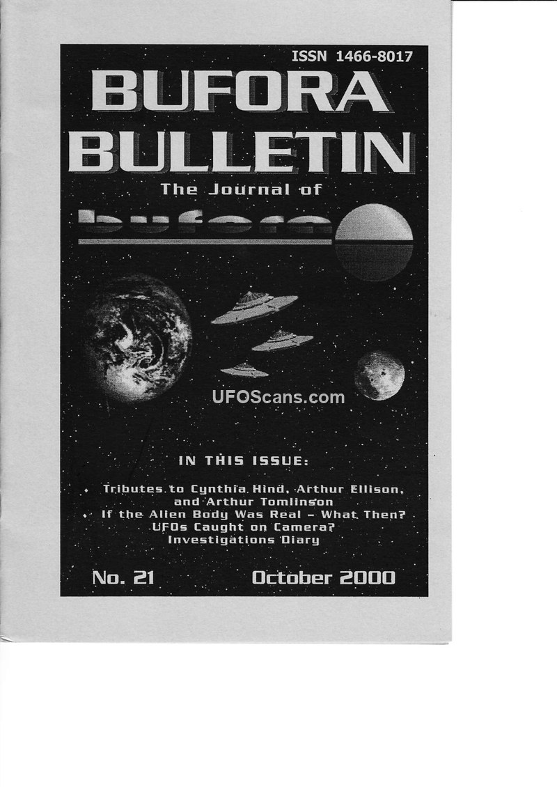 The BUFORA Bulletin No. 21 (October 2000) documents the activities, research, and administrative updates of the British UFO Research Association. It includes tributes to deceased researchers, investigations into anomalous phenomena, and reports on specific UFO sightings and historical crash cases.
