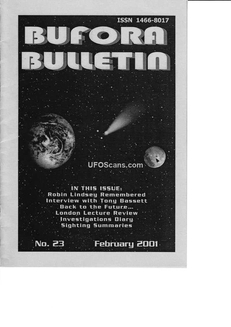 This document is the February 2001 issue (No. 23) of the BUFORA Bulletin, the official publication of the British UFO Research Association. The issue serves as a record of the association's activities, administrative updates, and research findings. A significant portion of the bulletin is dedicated to the memory of Robin Lindsey, a long-standing council member and sound recordist who passed away in February 2001. The editorial by Brian P. James highlights the association's upcoming 40th anniversary and plans for a conference in 2002. The bulletin features an extensive interview with Tony Bassett, the inventor of 'Mind Machines' and 'Bio-Energiser' devices, which he claims facilitate out-of-body experiences and healing. The interview explores the technical and metaphysical aspects of these devices, with BUFORA expressing interest in conducting future research experiments with them. The 'Investigations Diary' by Gloria Heather Dixon provides a summary of recent UFO reports, noting a decline in total reports but an increase in those with high 'strangeness' factors. She discusses the challenges of investigating abduction claims, the influence of media and internet mythology, and the potential role of mental health issues in some reports. Specific sighting summaries are included, such as a triangular formation in Larne, Northern Ireland (October 2000), a black triangle in Didcot (November 2000), and a sighting near the M20 motorway in Kent (January 2001). The bulletin also includes a review of a London lecture given by Matthew Williams, a crop circle constructor who discusses his methods and his conviction for criminal damage. The issue contains a 'Letters Section' where Ernie Sears offers a critical perspective on the writings of Brian Allan and others regarding UFOs and paranormal phenomena. Finally, the bulletin provides administrative notices, including the postponement of the Annual General Meeting, and a book review of Nick Redfern's 'The FBI Files', which examines the Federal Bureau of Investigation's involvement in UFO research.