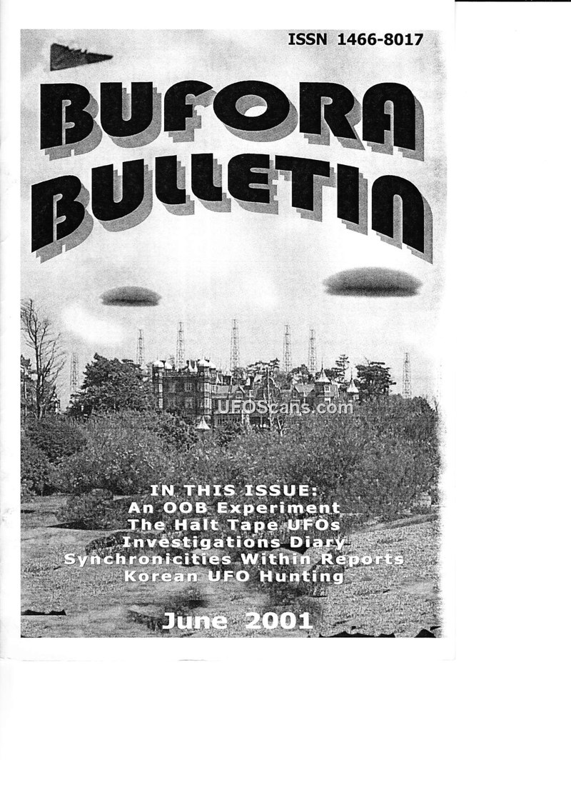 This document is the June 2001 issue of the BUFORA Bulletin, containing research articles, investigation reports, and international news regarding Ufology. It provides critical analysis of the Rendlesham Forest incident, OOB experiments, and various sighting reports from the UK and abroad.