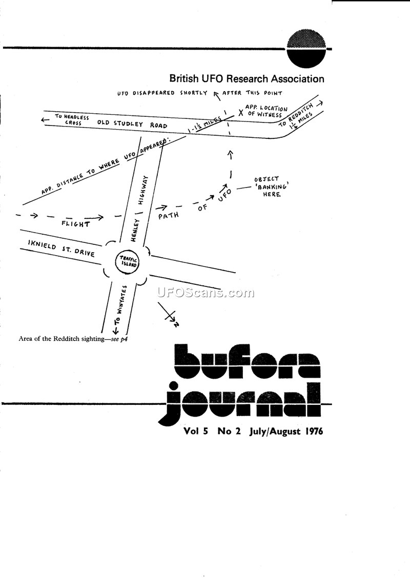 This document is the July/August 1976 issue of the Bufora Journal, containing a detailed UFO sighting report from Redditch, organizational research updates, and historical analysis of UFO-related folklore. It provides insight into the British UFO Research Association's methodology and internal administrative state during the mid-1970s.