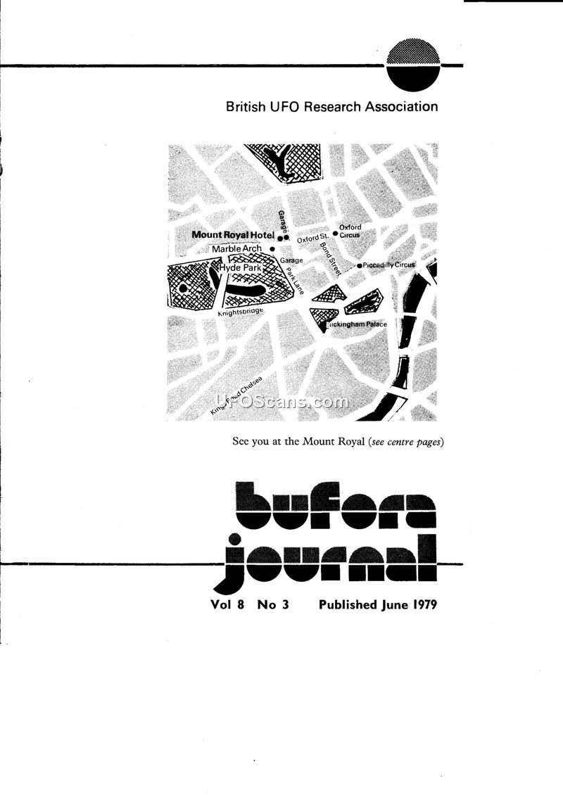 This BUFORA Journal issue from June 1979 documents various UFO sighting reports, organizational updates, and research initiatives. It includes detailed accounts of abduction claims, 'Men in Black' encounters, and preparations for the First London International UFO Congress.