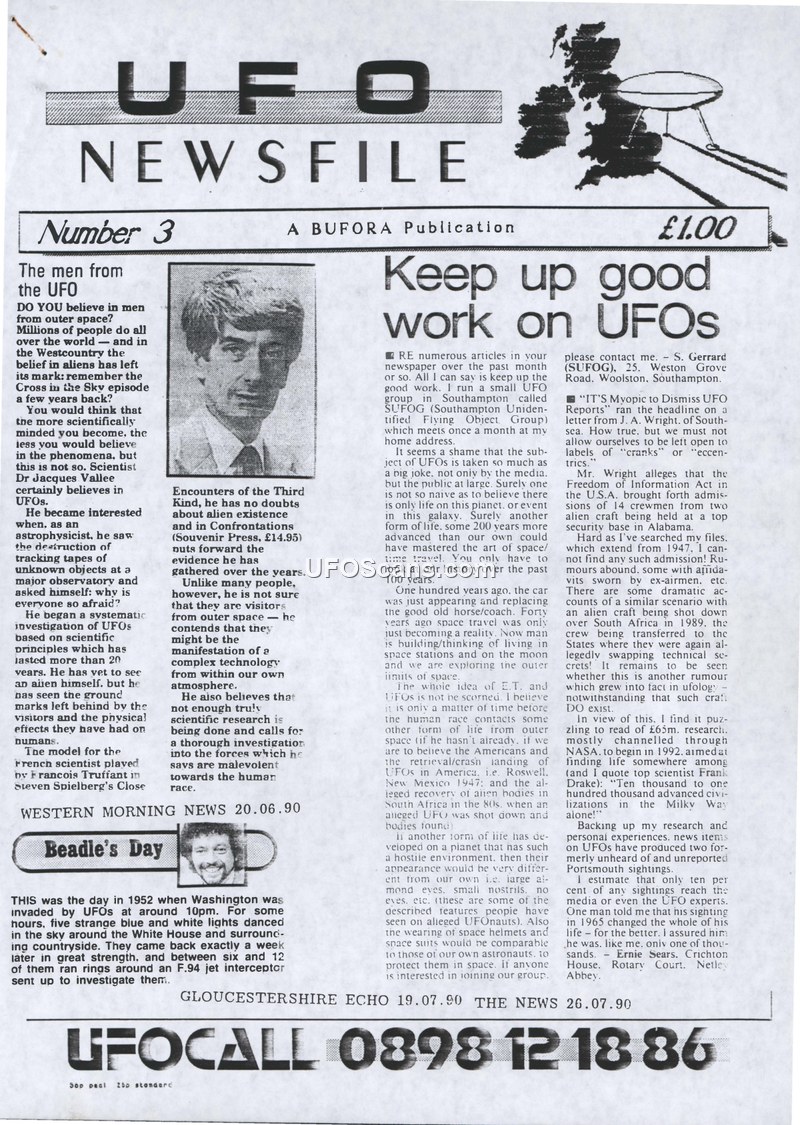This document, identified as 'UFO NEWSFILE Number 3', is a compilation of press cuttings and reports curated by the British Unidentified Flying Object Research Association (BUFORA). The publication serves as a repository for various accounts of Unidentified Aerial Phenomena (UAP) and crop circle formations occurring primarily within the United Kingdom during the late 1980s and early 1990s. The content reflects a broad spectrum of perspectives, ranging from scientific inquiry and sociological analysis to anecdotal reports from the public.