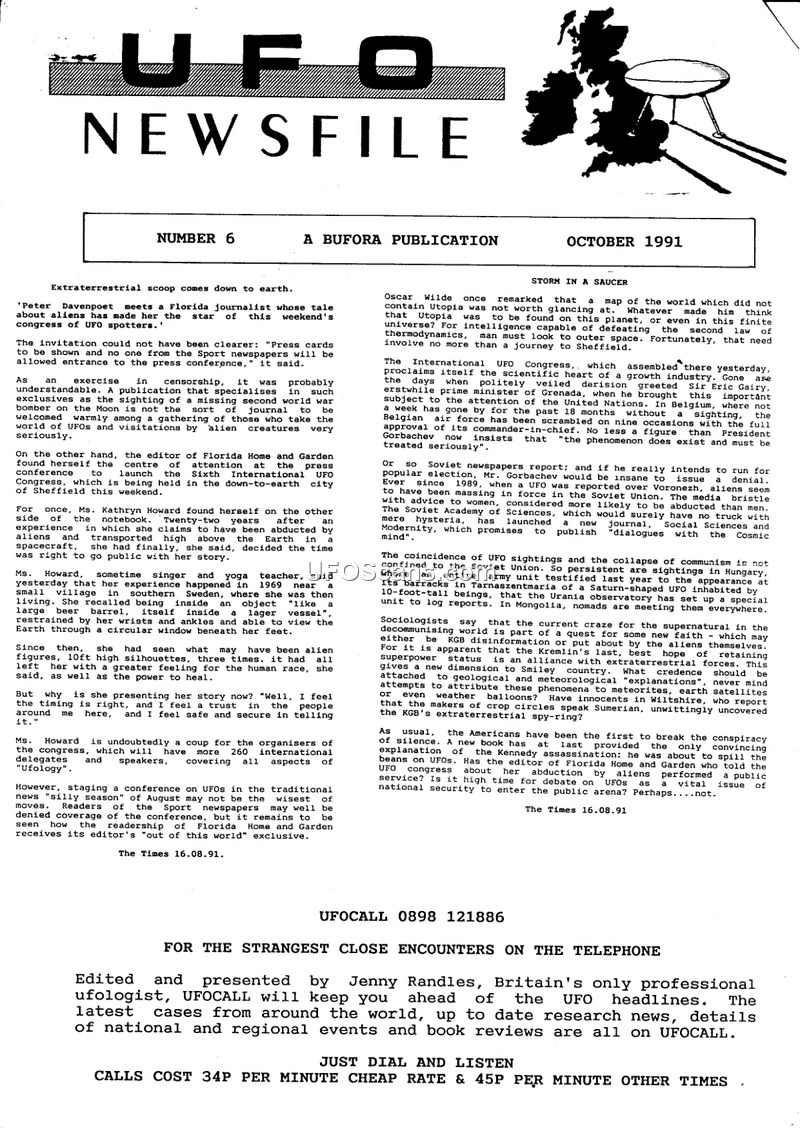 This newsletter from the British UFO Research Association (BUFORA) provides a 1991 overview of international UFO congresses, abduction claims, and the ongoing debate over crop circles. It serves as a record of contemporary ufological discourse, including reports on sightings and organizational updates.