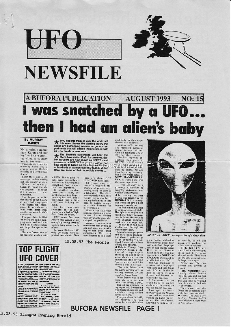 This document is the August 1993 issue (No. 15) of the BUFORA Newsfile, a compilation of reports, articles, and news snippets concerning Unidentified Aerial Phenomena (UAP) and UFO sightings. The newsletter covers a wide range of topics, including personal accounts of alleged abductions, such as the case of a woman in Manchester who claimed to have been taken by aliens and subsequently experienced medical issues. It also details various sighting reports from across the United Kingdom, including incidents in South Wales, Scotland, and North Wales. The publication highlights the challenges faced by UFO researchers, noting a perceived 'drought' in sightings during 1993 and the social stigma often associated with reporting such events. Several articles discuss the efforts of organizations like the Independent UFO Network and Strange Phenomena Investigations to document and analyze these reports. Additionally, the newsletter features educational initiatives, such as a six-week course on UFOs at Llandrillo College led by Margaret Fry. The document also includes international perspectives, such as a report on a UFO sighting in Illinois, USA, which was later attributed to a rocket re-entering the atmosphere. The newsletter serves as a platform for sharing information, promoting conferences, and providing resources for enthusiasts, including contact information for the MUFON-BBS network and the UFO Times newsdesk. Throughout the text, there is a recurring theme of skepticism versus belief, with contributors emphasizing the need for serious, scientific investigation into UAP to move beyond the 'little green men' stereotype.