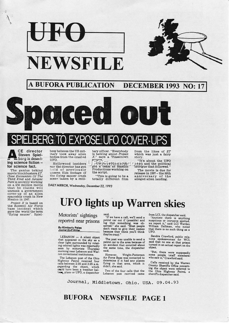 BUFORA Newsfile No. 17, published in December 1993, serves as a compilation of various UFO-related news reports, sightings, and media coverage from throughout 1993. The document covers a wide range of topics, including reports of a film project by Steven Spielberg regarding the Roswell incident, various sighting reports from across the United Kingdom and the United States, and the activities of ufologists and organisations such as the Independent UFO Network and the British UFO Research Association.