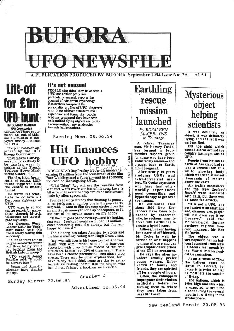 This document is the September 1994 issue (No. 23) of the BUFORA UFO Newsfile, a publication produced by the British UFO Research Association. The newsletter serves as a compilation of various press reports, articles, and news snippets concerning UFO sightings, crop circles, and abduction phenomena from around the world. Key topics include the funding of UFO research, with mentions of Italian MEP Tullio Regge's efforts to secure EC funding for a central UFO research facility. The publication highlights the activities of various individuals, such as Troggs star Reg Presley, who used royalties from his music to fund crop circle investigations, and Harvey Cooke, who established a support group in New Zealand for alleged alien abductees. The newsletter also covers specific sighting reports, including a mysterious object seen over New Zealand (later identified as a meteorological balloon), sightings in the Scottish Highlands, and a report by a York postman, John Hunt, regarding an object over the River Ouse. Additionally, the document features academic and cultural perspectives on the UFO phenomenon, including discussions on the work of Harvard psychiatrist John Mack regarding abduction claims and an analysis of how science fiction films reflect societal fears. The newsletter emphasizes the ongoing public interest in UAP, the role of private research groups like Quest International and NUFORC, and the skepticism surrounding these reports, noting that many sightings are often attributed to natural phenomena or hoaxes.