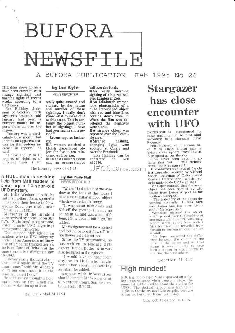 This document is a February 1995 edition of the BUFORA (British UFO Research Association) Newsfile. It serves as a compilation of various press reports, letters, and articles concerning UFO and UAP sightings across the United Kingdom and internationally. The newsletter highlights a significant increase in reported sightings in Scotland, as noted by Ron Halliday of the Scottish Earth Mysteries Research. It includes specific accounts of sightings, such as a 'bluish disc-shaped object' seen near Liberton, a 'red ball' over Edinburgh Zoo, and a 'star-shaped object' photographed by an Edinburgh woman. The document also features reports from Oxfordshire, where a stargazer named Steve Freeman observed a 'bright white sphere' traveling at high speed. Another section details a 14-year-old mystery involving a triangular object seen in Hull in 1981. Beyond sighting reports, the newsletter explores broader cultural and scientific themes related to the UFO phenomenon. It includes an 'Orthodox Voice' column by John Michell discussing C.G. Jung's theories on UFOs, the controversy surrounding cold fusion, and the perceived decline of modern science. There are also reports on the intersection of UFO interest with other fields, such as crop circle research, parapsychology, and the influence of popular media like 'The X Files' and 'Horizon' on public perception. The document notes the reluctance of governments, including the UK, US, and Russia, to release details on UFO sightings, and mentions the efforts of various UFO research groups to collect and analyze data. It also touches upon the 'alien abduction' phenomenon, citing the work of Professor David Jacobs and the skepticism of psychologist Dr. Susan Blackmore. The newsletter concludes with information on how to contact UFO research groups and encourages readers to report their own experiences to help build a collective database of sightings.