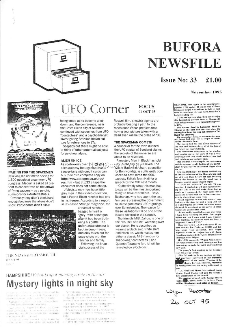 This document is Issue No. 33 of the BUFORA Newsfile, dated November 1995. It serves as a compilation of various UFO-related news reports, sightings, and commentary from across the United Kingdom. The newsletter covers a wide range of topics, including the ongoing interest in the 'alien autopsy' footage, the activities of Councillor Billy Buchanan in Bonnybridge regarding mass UFO sightings, and the efforts of various groups to pressure the government for information. Several individual sighting reports are detailed, including accounts from Nuneaton, Taunton, and the Wiltshire area. The newsletter also features profiles of prominent figures in the field, such as former police sergeant and UFO investigator Tony Dodd and nuclear physicist Stanton T. Friedman. The content reflects the broader cultural and social atmosphere surrounding UAP research in the mid-1990s, highlighting both the skepticism of the public and the persistent efforts of enthusiasts to uncover government secrets. The document includes references to specific incidents, such as the 'Roswell incident' and the 'Council of Nine,' and discusses the legal aspects of UFO research, including an obscure regulation regarding the quarantine of alien hands. The newsletter also provides information on local UFO groups and upcoming conferences, illustrating the grassroots nature of the movement at the time.