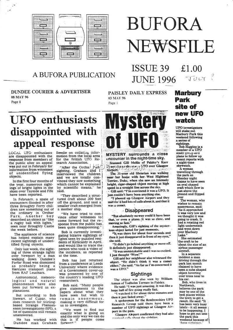 This document is Issue 39 of the BUFORA Newsfile, dated June 1996. It serves as a compilation of various press reports and articles concerning Unidentified Aerial Phenomena (UAP) and UFO sightings across the United Kingdom. The newsletter aggregates reports from multiple regional newspapers, including the Dundee Courier, Paisley Daily Express, The Scotsman, and the Lancashire Evening Telegraph. The content covers a wide range of incidents, from individual sightings of bright lights and cigar-shaped objects to more complex claims of alien abduction and government cover-ups. Notable figures mentioned include UFO investigator Jenny Randles, researcher Duncan Lunan, and Ministry of Defence official Nick Pope, who managed the 'X-Files' desk at the MoD. The document highlights the tension between public interest in UFOs and official explanations, which often attribute sightings to natural phenomena, meteors, or secret military testing. Specific incidents detailed include the 1970s encounter by Bob Taylor near Livingston, which is discussed in the context of potential military hoaxes or secret hardware testing. The newsletter also features reports of abduction claims, such as that of Ros Reynolds-Parnham, and the general frustration among UFO enthusiasts regarding the lack of transparency from government authorities. The document provides a snapshot of the UFO discourse in the UK during the mid-1990s, reflecting a mix of genuine public concern, media sensationalism, and the ongoing efforts of organizations like BUFORA to document and investigate these phenomena.