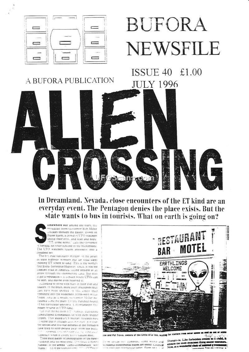 This document is Issue 40 of the BUFORA Newsfile, dated July 1996. It serves as a compilation of reports, articles, and commentary regarding UFO and UAP phenomena. The publication covers a wide range of topics, including the tourism industry surrounding the 'Dreamland' area in Nevada, the alleged existence of the 'Extra-Terrestrial Highway,' and the activities of various UFO researchers and witnesses. A significant portion of the content is dedicated to the 'Black Triangle' sightings in the United Kingdom, specifically referencing incidents involving commercial airliners and military aircraft. The newsletter features contributions from Nick Pope, a former Ministry of Defence UFO desk officer, who discusses the implications of UFO sightings and the government's stance on the subject. The document also touches upon the 'Project Aurora' theory, suggesting it as a potential explanation for some of the observed triangular craft. Additionally, it includes reports of local sightings in the North-East of England, Cheltenham, and Scotland, highlighting a perceived increase in UFO activity. The publication maintains a critical yet inquisitive tone, documenting witness testimonies, such as that of Roland Jov, while also addressing the skepticism of official government bodies like the Pentagon and the Ministry of Defence.