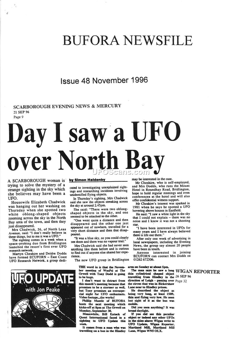 This document is Issue 48 of the BUFORA Newsfile, dated November 1996. It serves as a compilation of press reports and news clippings regarding UFO and UAP sightings across the United Kingdom during September and October 1996. The newsletter highlights a significant surge in reported sightings, including incidents in Scarborough, Fife, Dorset, Fleetwood, and the West Midlands. Witnesses describe various phenomena, ranging from white oblong-shaped objects and bright lights to triangular formations. The document details the involvement of various UFO research groups, such as the newly formed ECUFORN (East Coast UFO Research Network) and the London UFO Studies group, who are actively investigating these reports. Several sightings involve claims of video footage, including a controversial report of UFOs 'carving' a crop circle in Wiltshire. The document also captures the skepticism and official responses from authorities, such as the Ministry of Defence and RAF radar operators, who often attribute these sightings to conventional aircraft, weather balloons, or atmospheric conditions. Notable figures mentioned include Philip Mantle of BUFORA and researcher Roger Lowless, who discuss the challenges of investigating these reports and the potential for misidentification of secret military aircraft, such as the Stealth fighter. The newsletter reflects the intense public interest in the subject during this period, fueled by media coverage and the cultural influence of programs like 'The X-Files'.