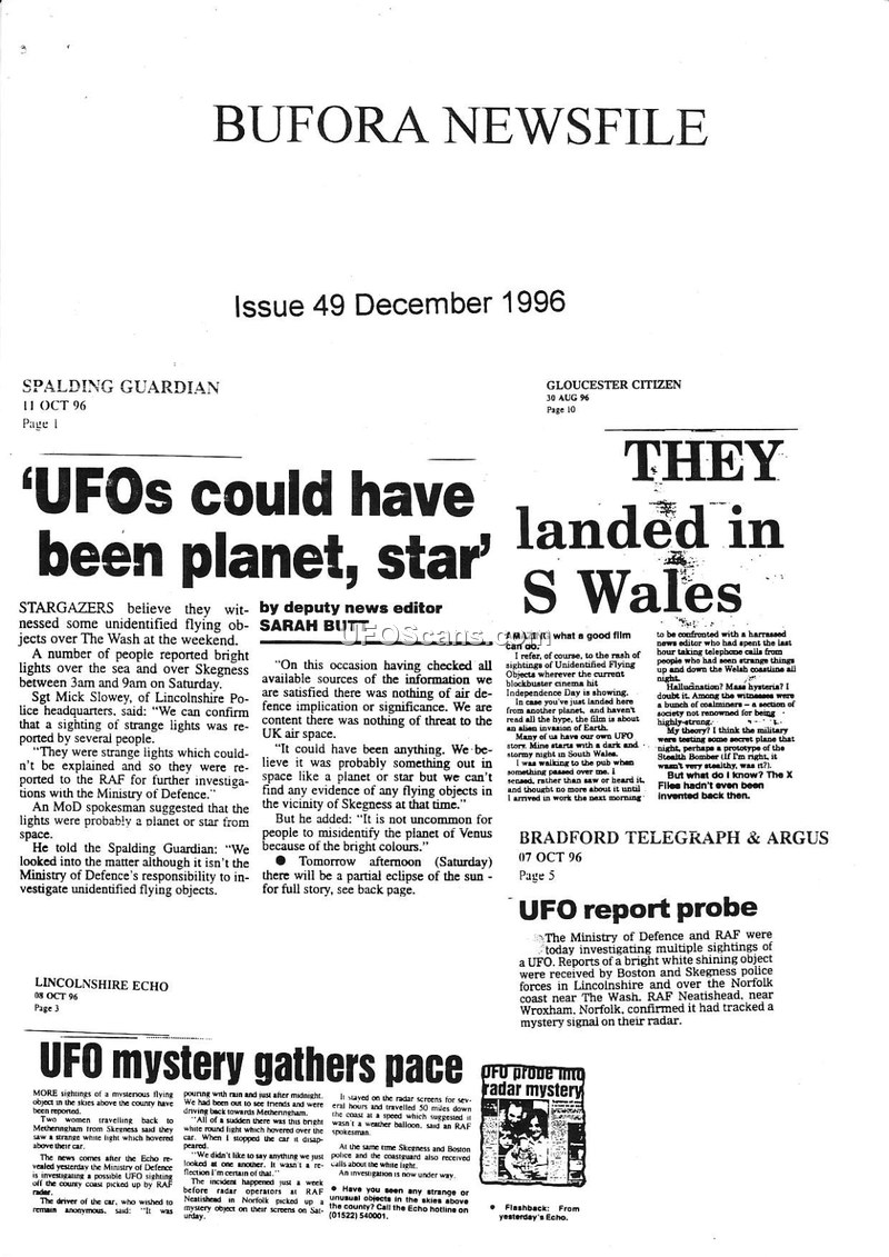 This document, Issue 49 of the BUFORA Newsfile dated December 1996, serves as a comprehensive compilation of various newspaper reports regarding UFO and UAP sightings across the United Kingdom throughout 1996. The reports detail a wide array of phenomena, including sightings of bright white lights over the sea, triangular-shaped craft, and disc-shaped objects. Several witnesses, including police officers and civilians, describe these objects as hovering, moving at high speeds, and occasionally being silent. The document highlights the involvement of the Ministry of Defence and the RAF, noting that while some sightings were attributed to planets, stars, or satellites, others remained unexplained. Specifically, the RAF at Neatishead confirmed tracking a mystery signal on their radar. The compilation also covers the growing interest in UFO research, mentioning upcoming conferences, the work of investigators like Derril Sims, and the activities of groups such as the Aetherius Society. The document reflects a period of heightened public interest in the subject, fueled by media coverage and the activities of various UFO research organizations. It captures the tension between official government explanations and the persistent, often unexplained, accounts provided by the public.