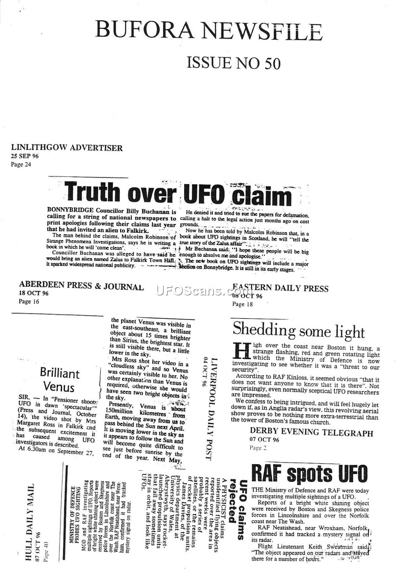 This document is Issue No. 50 of the BUFORA Newsfile, a compilation of various newspaper reports from late 1996 regarding UFO and UAP sightings across the United Kingdom. The reports cover a wide range of incidents, including sightings in Bonnybridge, Boston, Skegness, Norfolk, and Scotland. Several reports highlight the involvement of the Ministry of Defence and the RAF in investigating these phenomena, with some officials suggesting explanations such as weather conditions, space debris, or laser light shows. The document also features personal accounts from witnesses who claim to have seen unidentified objects, including cigar-shaped and saucer-shaped craft. Additionally, it mentions the cultural impact of these sightings, referencing the television show 'The X-Files' and the designation of Warminster as a 'UFO capital'. The compilation serves as a record of public interest and official responses to UAP reports during this period, reflecting a mix of skepticism, curiosity, and ongoing investigation by both civilian researchers and government bodies.