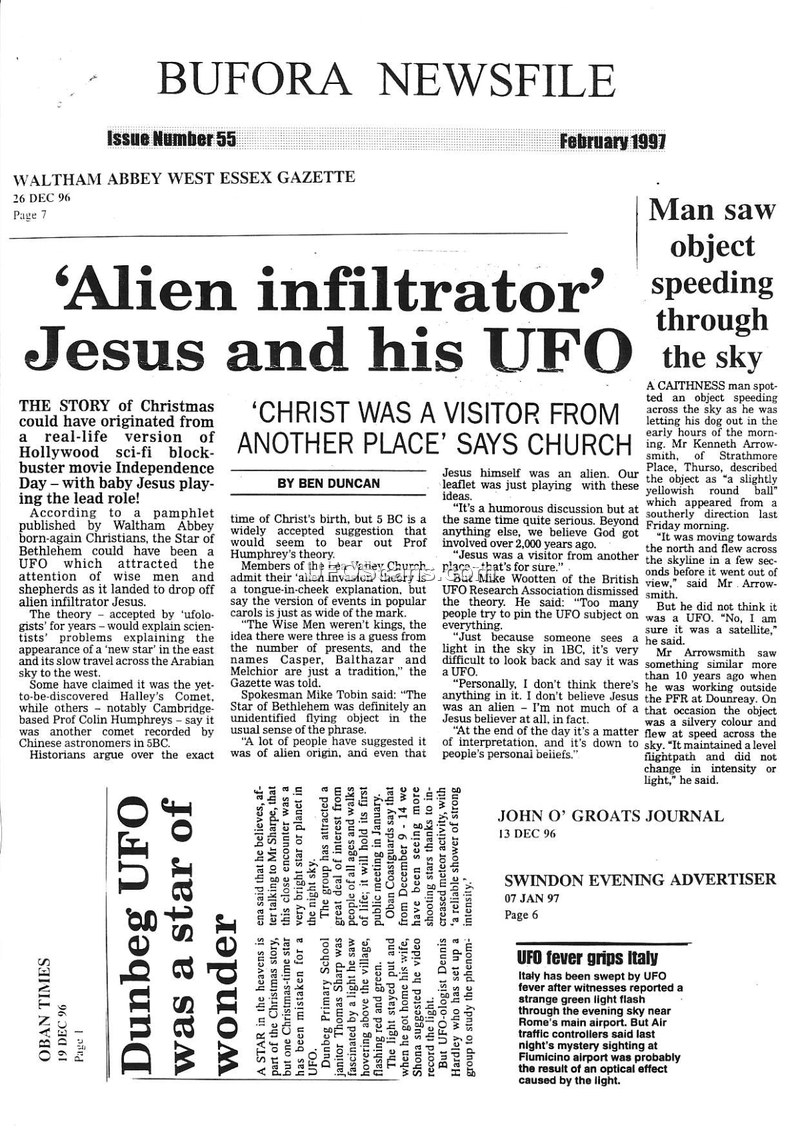This document is a compilation of press reports from late 1996 and early 1997, curated by the British UFO Research Association (BUFORA). It serves as a digest of various UFO and UAP sightings reported in local newspapers across the United Kingdom. The reports cover a wide range of phenomena, including sightings of 'cigar-shaped' objects, 'V-shaped' formations with red and white lights, and 'yellowish round balls.' Several reports highlight the skepticism of authorities, with some sightings being attributed to laser displays, satellites, or optical effects. The document also features discussions on the cultural impact of UFOs, referencing the influence of the 'X-Files' television series on public perception. Notable entries include reports of an 'alien infiltrator' theory regarding the Star of Bethlehem, the establishment of a counselling service for alien abductees by Eric Morris of BUFOS, and accounts of police officers witnessing unidentified aerial phenomena. The document reflects a period of high public interest in the subject, with surveys suggesting a significant portion of the British population believed in the existence of extraterrestrial phenomena or government cover-ups of UFO crashes. The compilation provides a snapshot of the contemporary discourse surrounding UAPs in the UK during the mid-1990s, capturing both the earnest investigations of enthusiasts and the dismissive responses from official bodies.