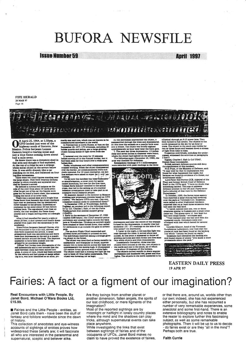 This document is Issue Number 59 of the BUFORA Newsfile, dated April 1997. It serves as a compilation of press clippings and reports regarding Unidentified Aerial Phenomena (UAP) and UFO sightings across the United Kingdom and internationally. The newsletter features various articles from newspapers such as the Fife Herald, The Scotsman, the Northwich Chronicle, and the Eastern Daily Press. The content covers a wide range of topics, including historical sightings like the 1964 Socorro, New Mexico incident involving Lonnie Zamora, and contemporary reports from the mid-1990s. Several articles discuss the surge in UFO interest in Scotland, specifically mentioning the work of David Colman and the Scottish Unexplained Phenomena Research group. Other sections explore the intersection of folklore and UAP, with Janet Bord investigating the links between fairy sightings and UFO occupants. The newsletter also highlights the skepticism of some investigators, such as Stuart Campbell, who argues that many sightings can be explained by natural phenomena or atmospheric conditions. Additionally, the document includes reports on UFO-related media, such as television programmes and books, and mentions the activities of various research groups like the Lancashire Aerial Phenomena Investigation Society. The overall tone is one of documenting public interest, media coverage, and the ongoing debate between believers and skeptics regarding the nature of UAP.
