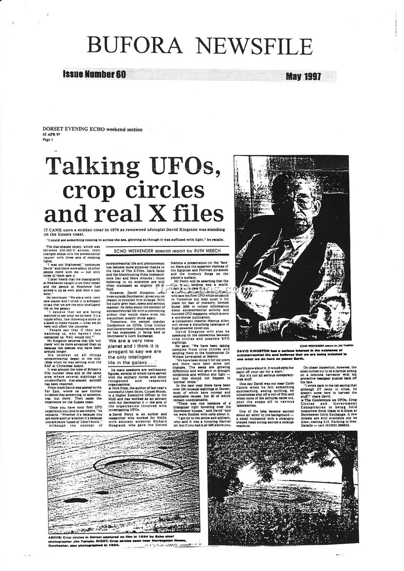 This document is Issue Number 60 of the BUFORA Newsfile, dated May 1997. It serves as a compilation of various press reports and articles concerning UFO sightings, crop circles, and alleged alien abductions in the United Kingdom and abroad. The newsletter features accounts from individuals such as David Kingston, who describes a 1976 sighting of a disc-shaped object, and Linda Cortile, who claims to have been abducted in New York. The publication discusses the work of UFO investigators like Budd Hopkins and mentions the involvement of academic researchers such as Michael Jacobs from Temple University. It also covers the closure of the U.S. Air Force's Project Blue Book, noting that the military concluded there was no evidence of extraterrestrial life or threats to the United States. Additionally, the newsletter includes reports on crop circles in Dorset, sightings in the North of England, and the public interest surrounding the Hale-Bopp comet, which some individuals erroneously linked to alien activity. The document reflects the broader cultural and media landscape of the late 1990s regarding UAP phenomena, highlighting the tension between public interest, media sensationalism, and official government dismissals.