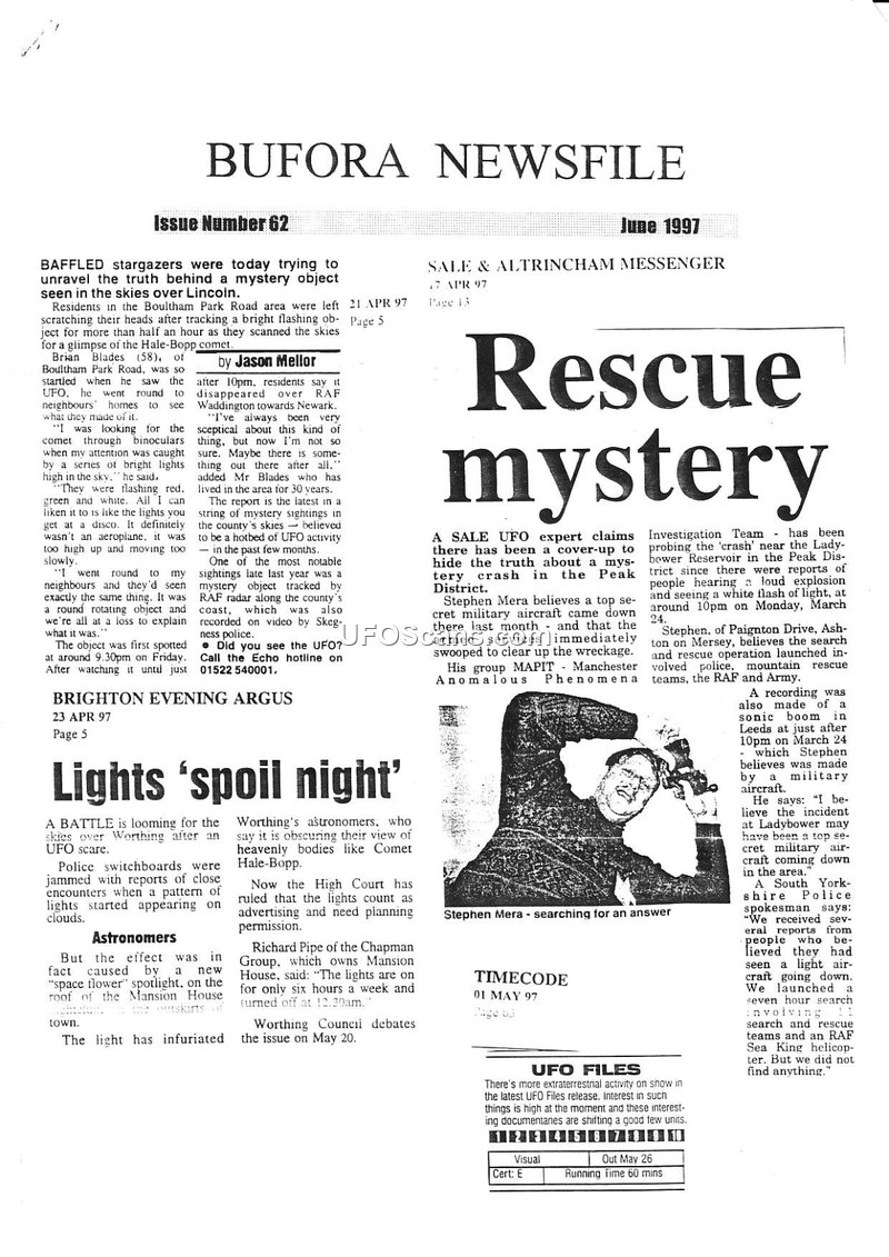 This document is Issue Number 62 of the BUFORA NEWSFILE, dated June 1997. It serves as a compilation of various UFO and UAP-related reports, news clippings, and commentary from across the United Kingdom during the early months of 1997. The newsletter covers a wide range of incidents, including a mystery object seen over Lincoln, a suspected crash in the Peak District investigated by Stephen Mera of MAPIT, and reports of lights over Worthing that were later attributed to a 'space flower' spotlight. The document also highlights the increasing frequency of UFO sightings, with local researchers like David Kingston noting a 50 percent increase in reports in the Dorchester area. Several personal accounts are included, such as the experience of Matt Punter, a student who encountered a UFO while driving in Cornwall, and the diary of Gordon Atkinson, who documented multiple sightings over several years. The newsletter also touches on the cultural impact of UFOs, mentioning the 'X-Files' television show, the 50th anniversary of the term 'flying saucer,' and various public events and conferences. The document reflects a period of heightened public interest in unidentified aerial phenomena, with reports involving police, the RAF, and various civilian research groups.