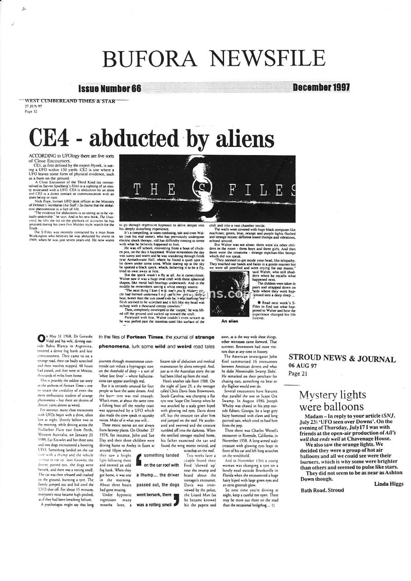 This document is a compilation of press clippings and articles from December 1997, published by the British UFO Research Association (BUFORA) in their 'Newsfile' newsletter. The collection serves as a historical record of UFO and UAP-related media coverage in the United Kingdom during the summer of 1997, which marked the 50th anniversary of the Roswell incident. The articles cover a wide range of topics, including personal accounts of alleged alien abductions, reports of hovering lights and 'cigar-shaped' craft, and the skepticism of astronomical societies regarding these sightings. Several pieces highlight the role of the CIA and the US Air Force in historical UFO cover-ups, referencing the declassification of documents that suggest military deception regarding the nature of UAPs. The newsletter also features book reviews, such as Michael Shermer's 'Why People Believe Weird Things,' which examines the psychological and sociological aspects of belief in pseudoscience and extraterrestrial phenomena. Throughout the document, various experts, including former Ministry of Defence UFO desk officer Nick Pope and local researchers like Bob Boyd, provide commentary on the difficulty of identifying aerial phenomena and the persistence of public interest in the subject. The document reflects a period of intense public and media scrutiny regarding UAPs, characterized by a mix of genuine witness reports, debunking efforts by scientists, and ongoing debates about government transparency.