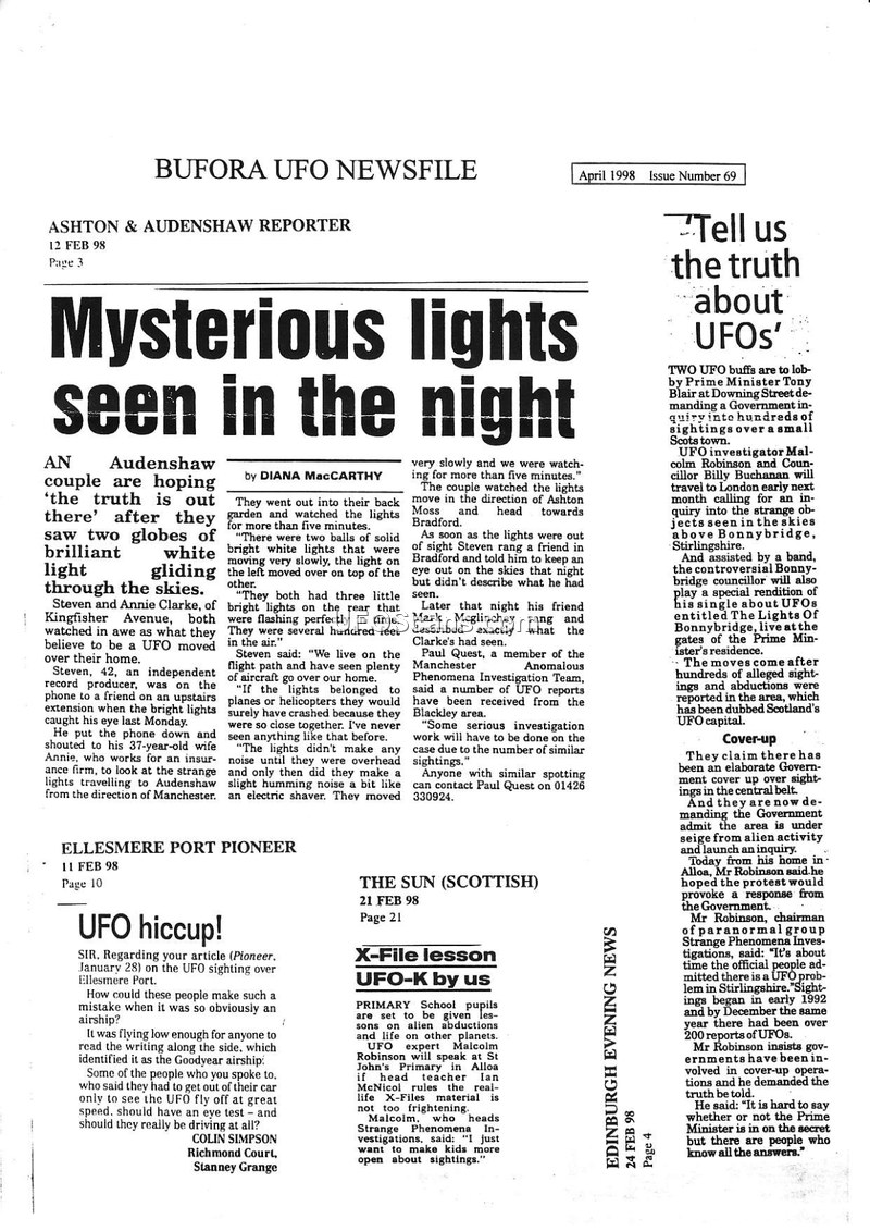 This document is a compilation of press clippings from February and March 1998, published in the BUFORA UFO Newsfile, Issue 69. It documents a widespread surge in UFO sightings across the United Kingdom, including reports from Audenshaw, Great Munden, Bonnybridge, and Cheshire. The reports describe various phenomena, such as globes of white light, triangular objects, and saucer-shaped craft. Several witnesses, including Steven and Annie Clarke, describe their experiences in detail, noting the lack of conventional aircraft characteristics. The document highlights the activities of various UFO research groups, such as the British Unidentified Flying Objects Studies Centre (BUFOSC) founded by Eric Morris, and Strange Phenomena Investigations led by Malcolm Robinson. These groups are actively collecting witness reports and calling for government inquiries into the phenomena. The clippings also address skepticism, with some reports attributing sightings to airships, weather balloons, or misidentified aircraft, while others discuss the cultural impact of UFOs, including the influence of the 'X-Files' television series. The document serves as a snapshot of the UFO research landscape in the UK during early 1998, reflecting both public interest and the efforts of amateur and professional investigators to document and explain these sightings.