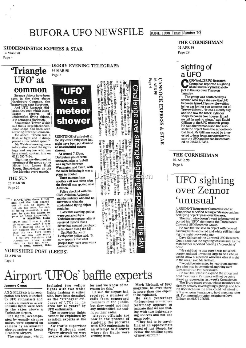 A BUFORA compilation of 1998 UK newspaper reports detailing a surge in UFO sightings, including radar-tracked triangular craft and amateur photographic evidence. The Ministry of Defence officially denied knowledge of the reported radar tracking at RAF Fylingdales.
