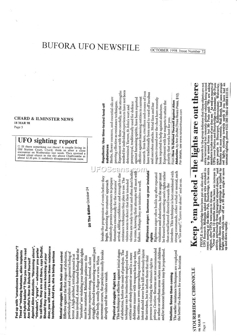 This BUFORA newsletter from October 1998 compiles various UFO reports, expert commentary, and historical accounts. It highlights the ongoing tension between public interest in UFO phenomena and official government dismissal or lack of conclusive evidence.